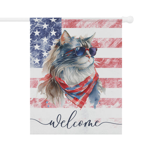 Patriotic Cat in Glasses Welcome 2-Sided Garden & House Flag/Banner