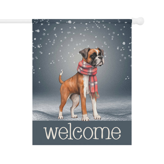 Snowy Welcome Boxer in Scarf 2-Sided Garden & House Flag/Banner