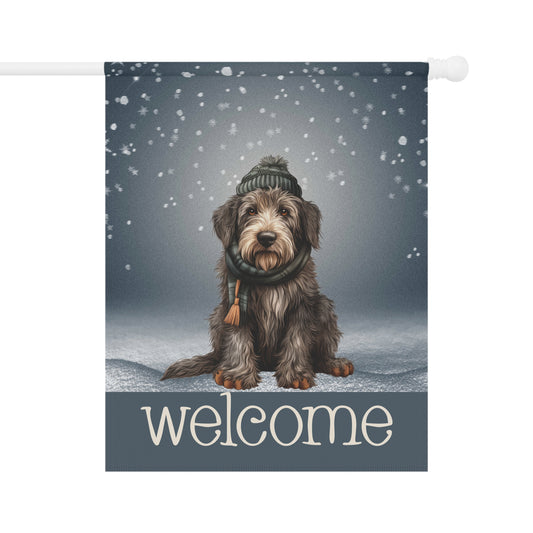 Snowy Welcome Irish Wolfhound in Scarf 2-Sided Garden & House Flag/Banner