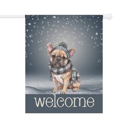 Snowy Welcome French Bulldog in Scarf 2-Sided Garden & House Flag/Banner