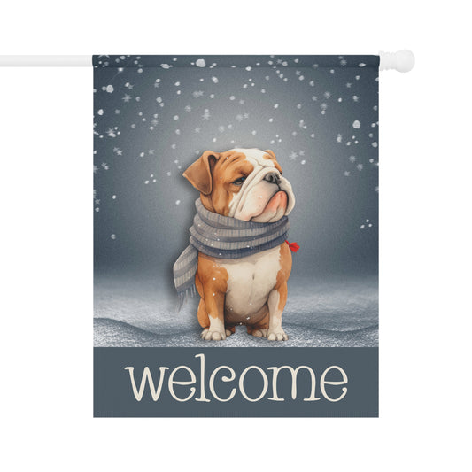 Snowy Welcome Bulldog in Scarf 2-Sided Garden & House Flag/Banner