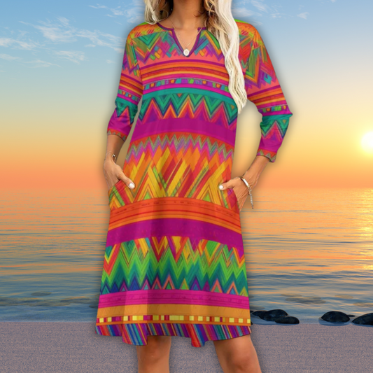 Waves V-neck 3/4 Sleeve Dress with Pockets