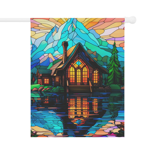 Mountain Cabin Paradise Stained Glass Look 2-Sided Garden & House Flag/Banner