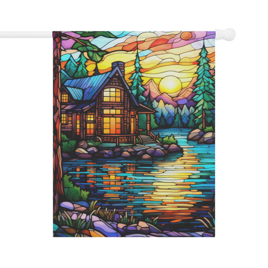 Sunset Mountain Cabin Stained Glass Look 2-Sided Garden & House Flag/Banner