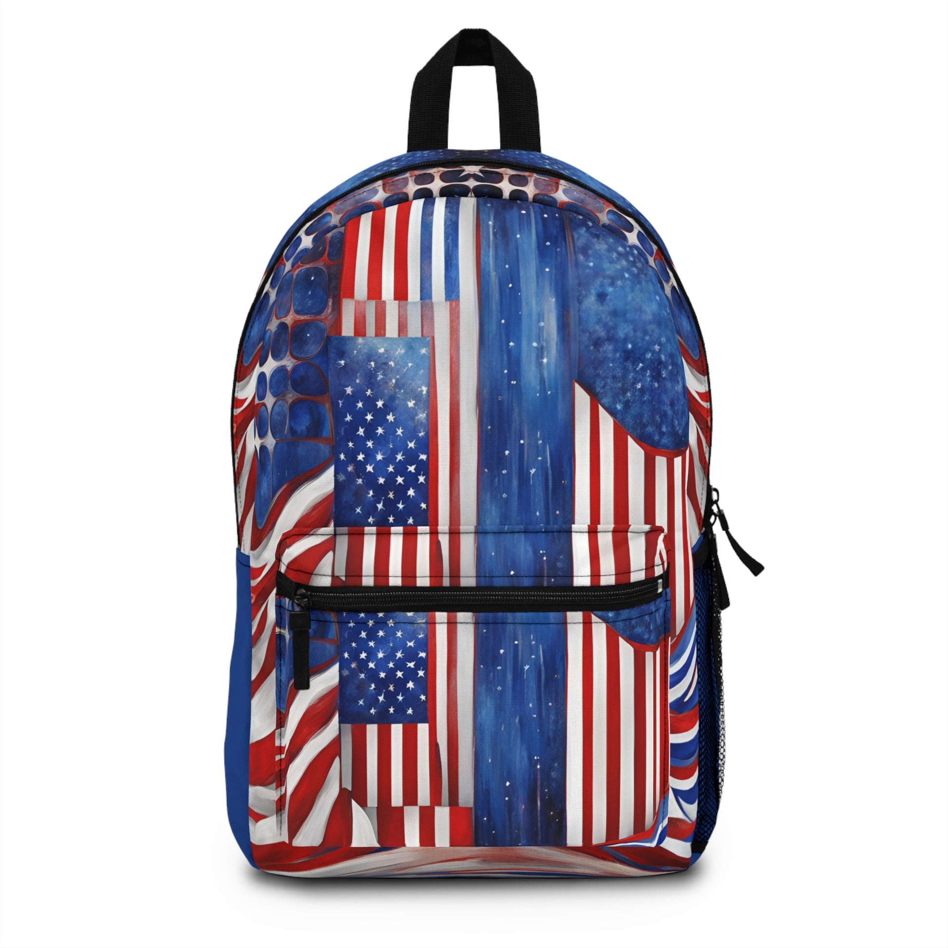 Have you got room for all that? With our roomy and durable USA Abstract backpack, you will! This bag is made from spun polyester and weights 1.3 lbs, just enough to be light, strong and long-lasting. Grab it, stow it, throw it onto the seat next to you, this backpack can take it, and so will you, wherever you go!