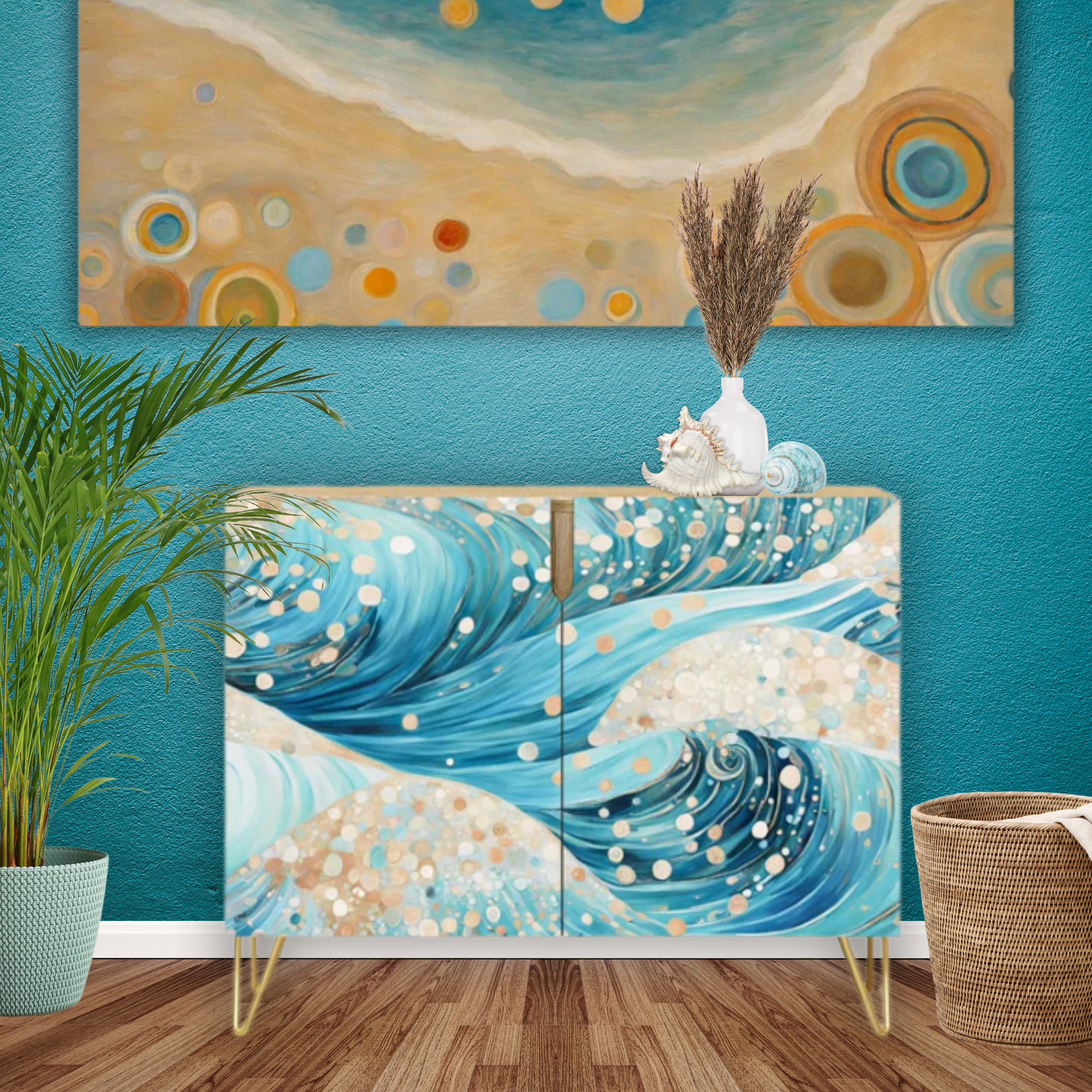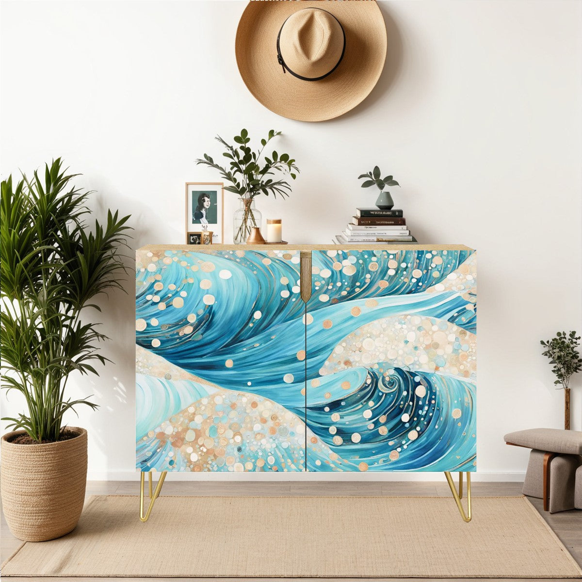 This modern storage cabinet is crafted with high-quality wood with unique UV-printed leather door fronts that are vibrant, fade-resistant, and easy to clean.. It features sturdy gold-tone metal legs and stainless steel hinges for added durability and elegance. Measuring 35"x17"x30", this cabinet offers a spacious interior for storing books, dishes, records, or home essentials, making it a versatile addition to any living room, hallway, or dining area.