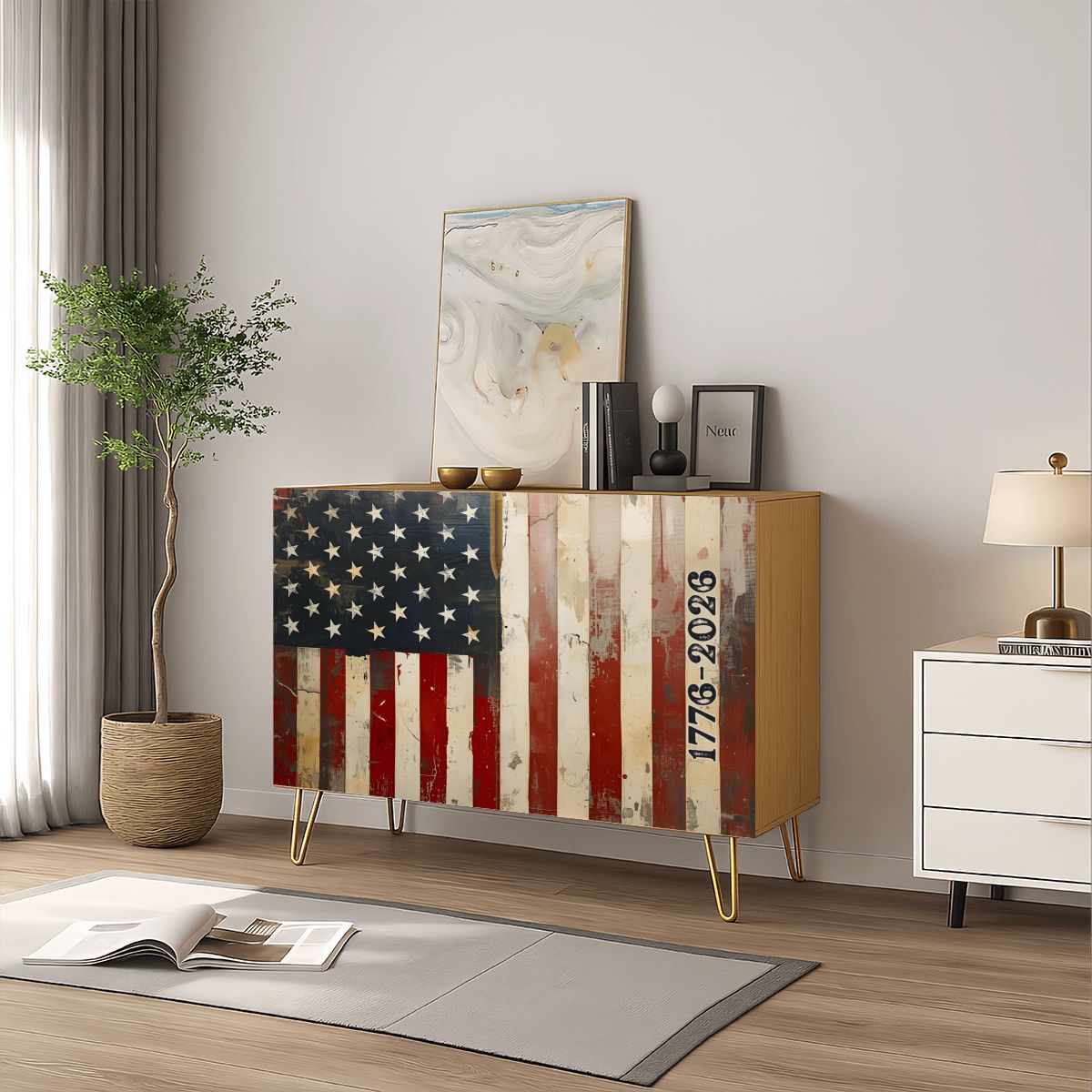 This modern storage cabinet with its rustic American Flag design and the years 1776-2026, is crafted with high-quality wood with unique UV-printed leather door fronts that are vibrant, fade-resistant, and easy to clean. It features sturdy gold-tone metal legs and stainless steel hinges for added durability and elegance. This cabinet offers a spacious interior with a fixed shelf for storing books, glasses, dishes, blankets, or home essentials, making it a versatile addition to any room, hallway, or dining area.