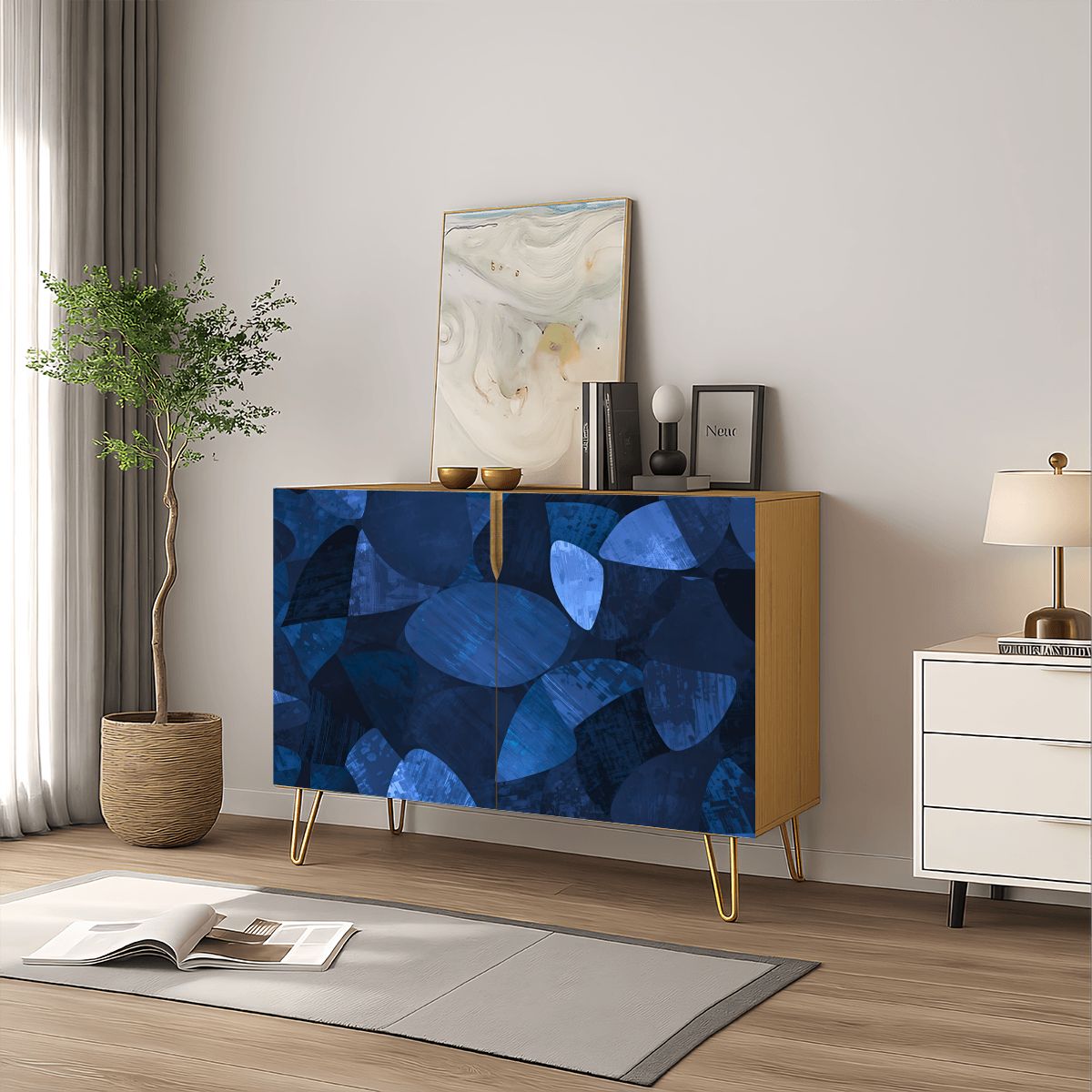 This modern storage cabinet with its contemporary design in shades of sapphire blue is crafted with high-quality wood with unique UV-printed leather door fronts that are vibrant, fade-resistant, and easy to clean. It features sturdy gold-tone metal legs and stainless steel hinges for added durability and elegance. This cabinet offers a spacious interior with a fixed shelf for storing books, dishes, records, or home essentials, making it a versatile addition to any living room, hallway, or dining area.